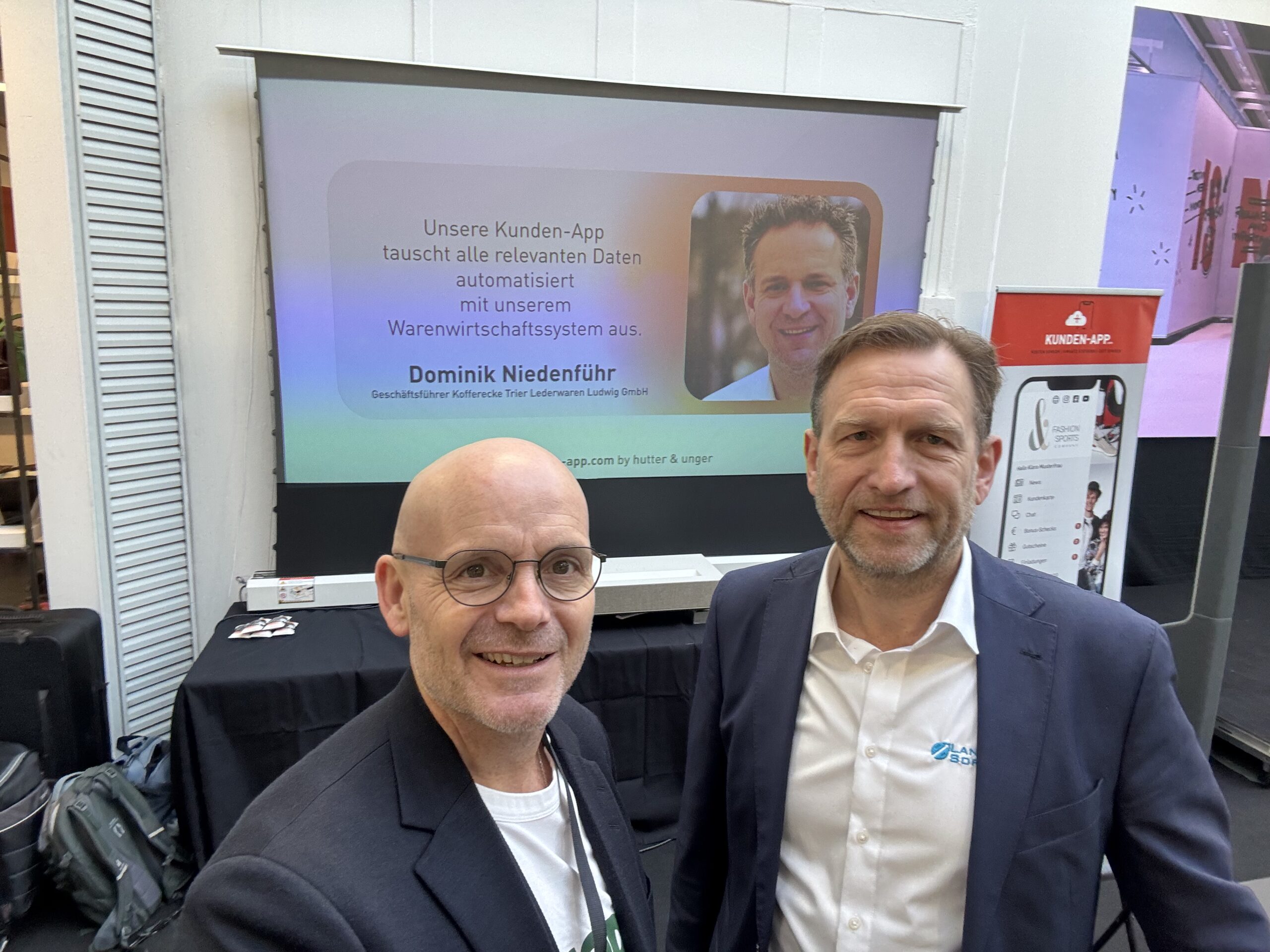 Wir informierten im FUTURE HUB der internationalen Lederwarenmesse über unsere Kunden-App für den Lederwarenhandel. Auch Maarten van Beek von der Landau Software schaute am Hutter & Unger Messestand vorbei, denn die Kunden-App verfügt natürlich auch über eine Schnittstelle zum Landau Infoman WWS – sowie übrigens zu fast allen gängigen Warenwirtschaftssystemen des Einzelhandels (mit über 15 angebundenen WWS). App-Experte Andreas Unger und Hilko de Buhr von advarics referierten zudem LIVE auf der ILM-Talk-Bühne darüber, wie sich der Lederwarenhandel via Kunden-App und Warenwirtschaft selbst revolutionieren kann. Danke an die ILM für die Organisation.
